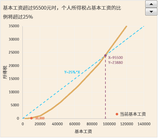 可以看出當(dāng)基本月薪超過95500元時(shí),個(gè)人所得稅在基本月薪中的占比將超過25%,并且基本工資越高,其值越大。
