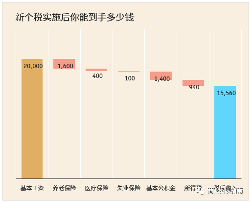 以月基本工資20000元為例,用一幅瀑布圖來展示: