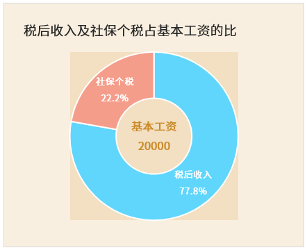 基本工資由企業(yè)支付,然后需要繳納社保金和個(gè)稅(這里簡(jiǎn)稱為社保個(gè)稅),剩下的就是稅后收入,下面這幅圖可以展示這兩塊的占比,同樣以基本月薪20000元為例: