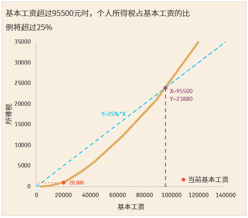 和前面?zhèn)€稅占基本工資的比例圖表所展示的一樣,當(dāng)基本工資超過95500元時(shí),個(gè)稅(也稱作所得稅)的曲線出現(xiàn)了一個(gè)拐點(diǎn),出現(xiàn)了一個(gè)表示所得稅上升速率超過其它指標(biāo)的拐點(diǎn)。