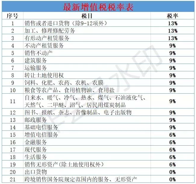 銷(xiāo)售交通運(yùn)輸服務(wù)、郵政、基礎(chǔ)電信、建筑、不動(dòng)產(chǎn)租賃服務(wù),銷(xiāo)售不動(dòng)產(chǎn),轉(zhuǎn)讓土地使用權(quán)以及銷(xiāo)售或進(jìn)口正列舉的農(nóng)產(chǎn)品等貨物(易混項(xiàng)見(jiàn)附件1)稅率為9%;加工修理修配勞務(wù)、有形動(dòng)產(chǎn)租賃服務(wù)和進(jìn)口稅率為13%;銷(xiāo)售無(wú)形資產(chǎn)(除土地使用權(quán) )為6%,出口貨物稅率為0;2、其余的:貨物是13%,服務(wù)是6%。