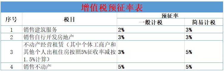 預(yù)征率有3檔,2%,3%和5%。簡(jiǎn)易計(jì)稅的預(yù)征率基本上與征收率一致。