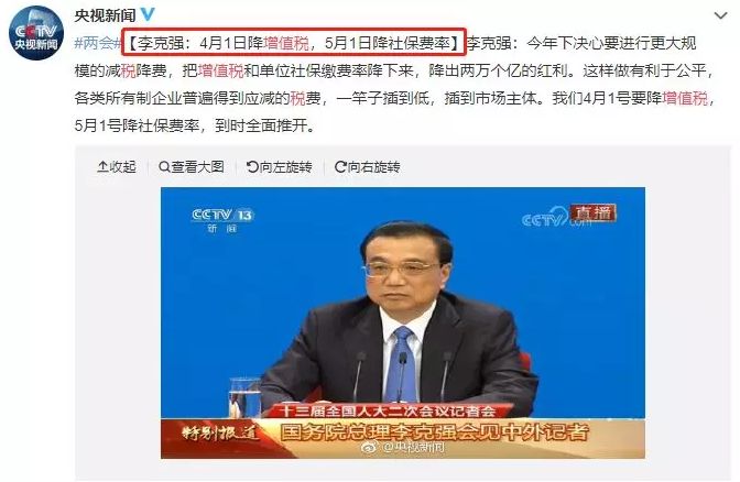 我們4月1號(hào)要降增值稅,5月1號(hào)降社保費(fèi)率,到時(shí)全面推開(kāi)。