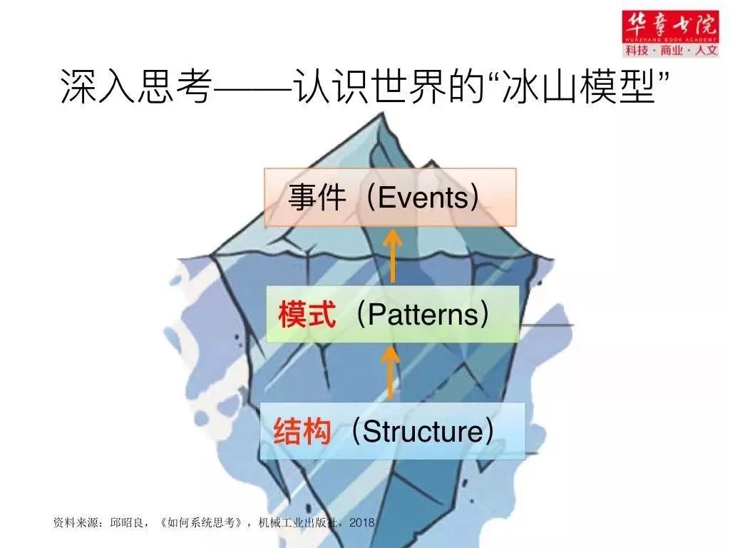 這個(gè)冰山模型實(shí)際上就是理解世界的三個(gè)層次,冰山浮在水面之上的就是我們理解事件的事件這個(gè)層面。