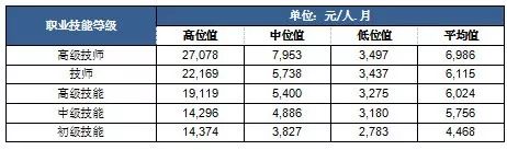 平均值方面,高級技師達到6986元/月,技師、高級技能人才也超過6000元/月,中級技能人才為5756元/月,初級技能人才為4468元/月。