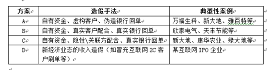 筆者以收入舞弊為例,總結(jié)了證監(jiān)會(huì)查處以及實(shí)務(wù)中IPO企業(yè)財(cái)務(wù)造假的案例,其典型性套路為:通過虛構(gòu)采購、銷售和偽造銀行回單(如果客戶配合則為真實(shí)銀行回單),實(shí)現(xiàn)自有資金/體外資金循環(huán),虛增銷售收入。主要包括以下四個(gè)類別: