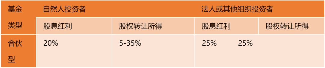 天津:津政發(fā)[2009]45號文的規(guī)定,在有限合伙形式的股權(quán)投資基金中,自然人為有限合伙人,按“利息、股息、紅利所得”或“財(cái)產(chǎn)轉(zhuǎn)讓所得”稅目征收個人所得稅,稅率為20%;自然人為普通合伙人,既執(zhí)行合伙業(yè)務(wù)又為基金的出資人的,取得所得能劃分清楚時,對其中的投資收益所或股權(quán)轉(zhuǎn)讓收益部分,稅率適用20%。