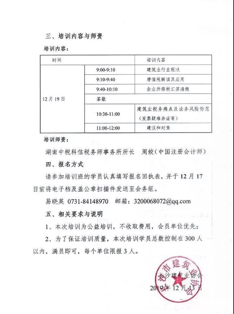 為幫助我市建筑企業(yè)享受減稅降費(fèi)的紅利,合理合法降低稅收負(fù)擔(dān),控制稅務(wù)風(fēng)險(xiǎn),我集團(tuán)聯(lián)合長沙市建筑業(yè)協(xié)會(huì)于2019年12月19日在長沙免費(fèi)為會(huì)員企業(yè)舉辦建筑行業(yè)“增值稅+企業(yè)所得稅”綜合應(yīng)用培訓(xùn)班。我集團(tuán)湖南中稅科信稅務(wù)師事務(wù)所所長主講。詳細(xì)通知如下: