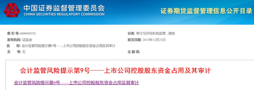 12月23日,證監(jiān)會(huì)發(fā)布《會(huì)計(jì)監(jiān)管風(fēng)險(xiǎn)提示第9號(hào)——上市公司控股股東資金占用及其審計(jì)》。